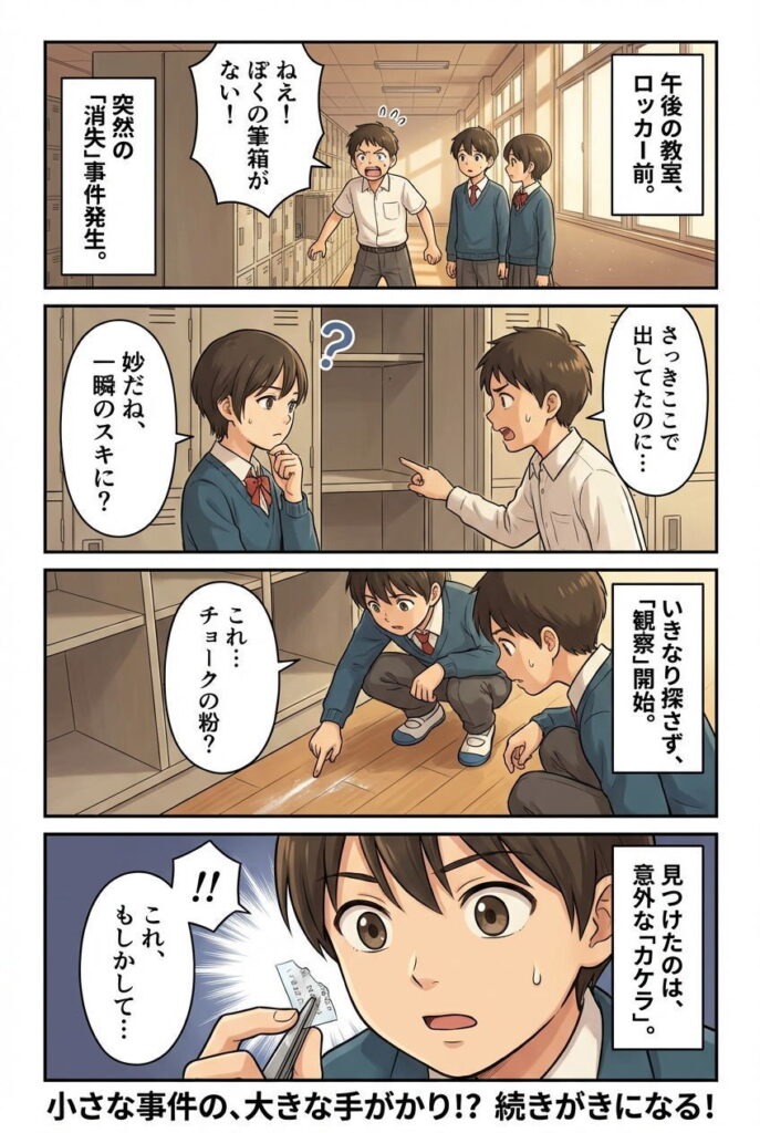 学級ロッカー前の小さな失踪事件は、だれも責めないまま、静かに終わった。